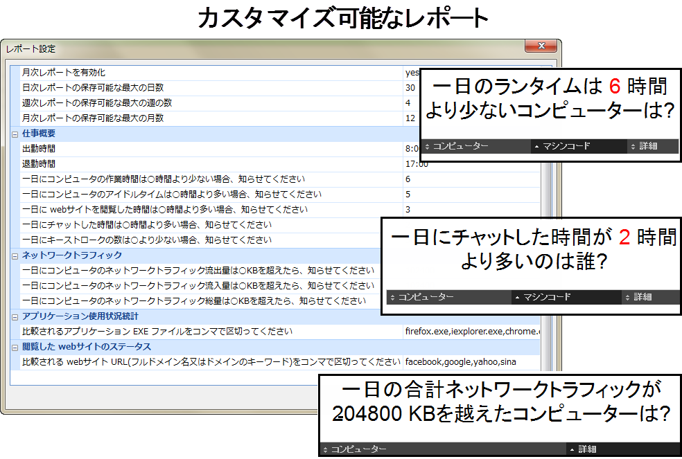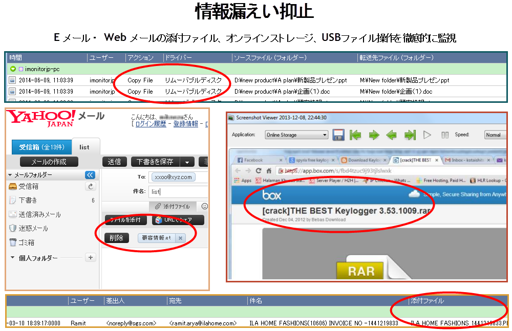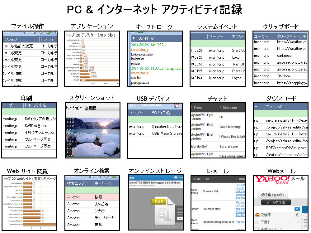 iMonitor PC監視ソフトは、社用PCの操作履歴を記録可能です。 キーストローク、クリップボード、スクリーンショット、ファイル操作(コピー、移動、貼り付け、消除、名前の変更、作成)、 印刷ジョブ、Eメール、webメール (Gmail、Yahoo mail、Hotmail及び他の人気webメール)、オンラインストレージ、 FTPファイル転送、Web閲覧、検索したキーワード、ダウンロード、アプリケーション利用状況、 チャット記録(Skype、ICQ、AIM、Googleトークなど) 、各種ストレージ(リムーバブルハードディスク、USBメモリー、メモリカード、スマホ)、ネットワークトラフィック量、 システムイベントなどを把握している。また、このソフトはステルスモードで、企業や政府機関のために開発されました。事前に設定されたポリシーに基づいて、危険或いは不適切なPC操作を検出してすぐ管理者にアラートを送ります。監視ログと警告を通じて、管理者がタイムリーに従業員詐欺、情報漏洩、私事をしてること、仕事低効率などについてのPC操作を発見できます。その上、管理者は作業条件と作業効果を基にして作業計画と作業方法をすぐに調整でき、生産効率を向上させます。iMonitor 従業員PC監視ソフトは360度全角度でPC操作を監視できるので、絶対間違いなく御社の営業管理に役に立てます。