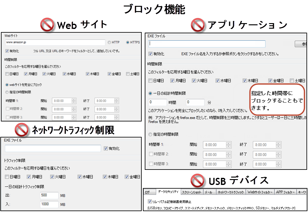 もし従業員が労働時間にチャットしたり、映画を見たり、ゲームをやったり、ほかの仕事と無関係なプログラムを実行したり、すると、大変な生産性ロスになるだけでなく、帯域幅の浪費にもなってしまいます。ネットを使う仕事も妨げられてしまいます。 言うまでもなく作業PC では業務に無関係のソフトを制限しなければなりません。iMonitor 従業員PC監視ソフトは指定した時間帯にフィルターをかけてアプリケーションとwebサイトを制限できます。また、ウェブサイトからファイルをダウンロードする時、ファイルをFTPサーバーからへ転送する時、ブロックされたアプリを使おうとする時、ブロックされたウェブサイトを開こうとする時、或いはアプリが大量にネットワークトラフィックを使ってる時、リアルタイムアラートが表示されます。御社のコスト管理にも役立ちます。