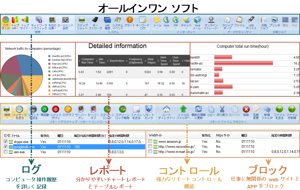 iMonitor PC監視ソフトはWindowsシステムとMac OS10.8+をサポートするだけでなく、Citrix & Terminal Serverもサポートする。また、データベースについて、iMonitor 従業員PC監視ソフトは第三者のデータベース(Microsoft SQL、MySQLなど)の購入を一切必要としないので、クライアントPCをサーバー端末に繋げるルターとサーバーPCが1つずつあれば十分な作業環境です。各印刷ジョブ、チャット履歴を追跡し、従業員詐欺とデータ損失によるダメージから会社を守ります。site-to-site VPN接続、インターネット接続もサポートできます。強力なレポートモジュールはパソコン利用情報の追跡・ 分析ができ、情報漏洩の危険から企業を守ることに全力でサポートいたします。